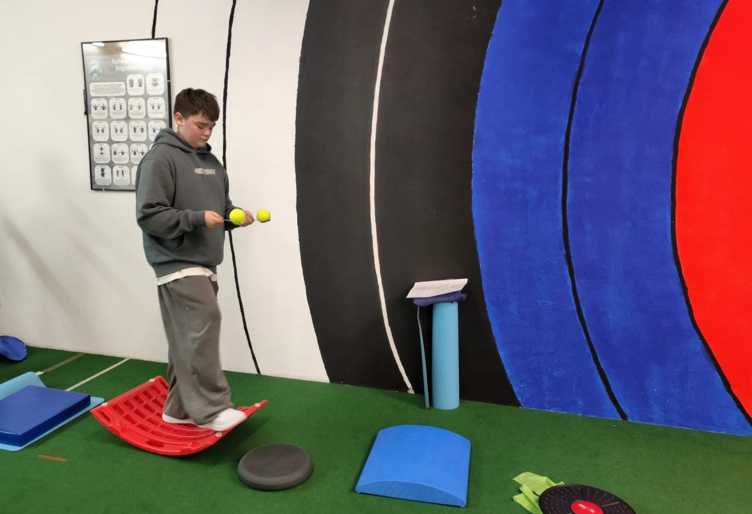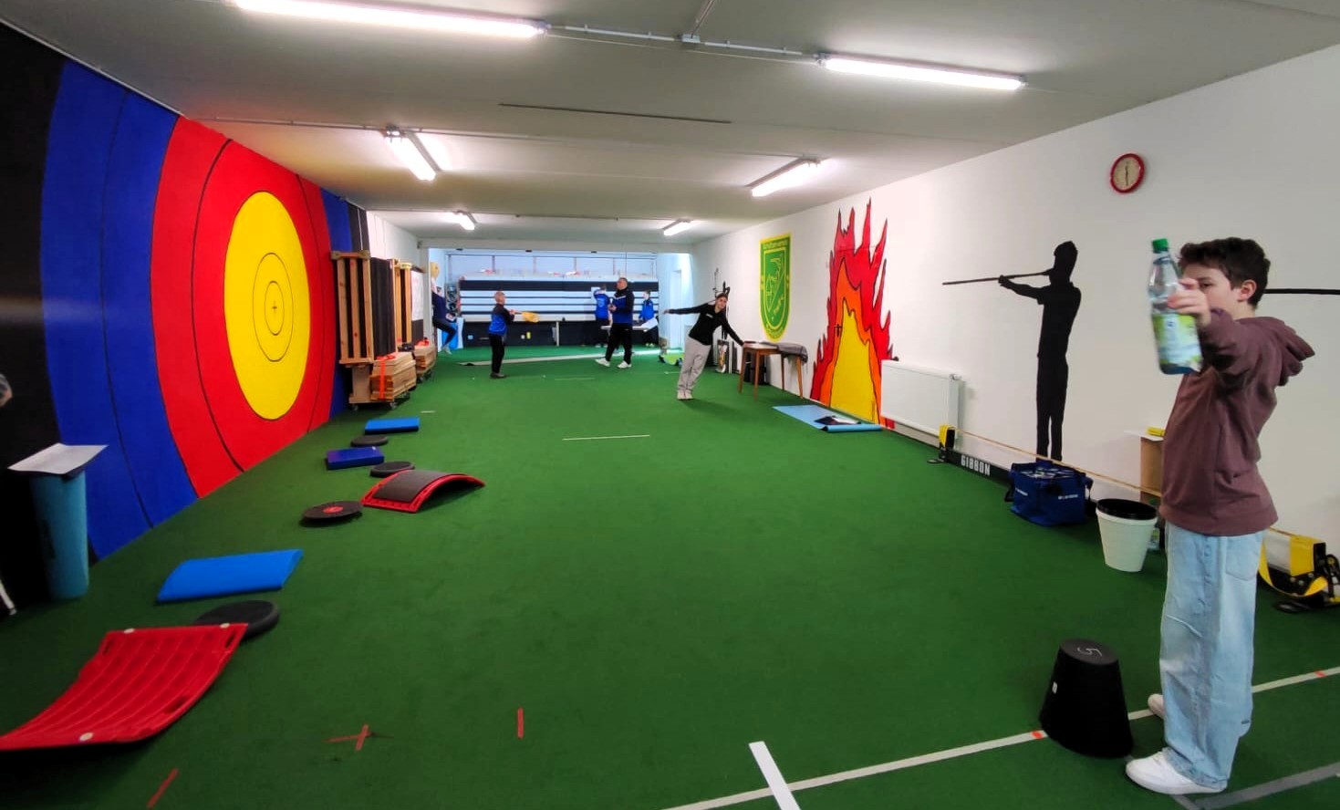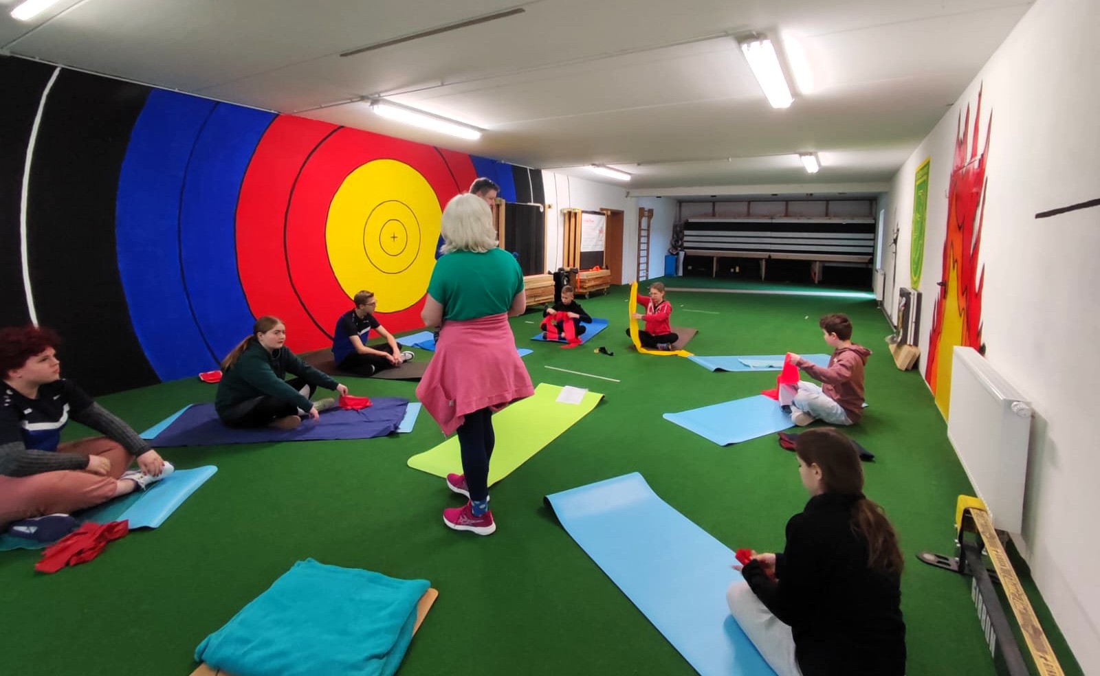 Nachdem uns bei der Physio-Einheit schon ordentlich eingeheizt wurde und während wir eine kleine Pause im Wirtschaftsraum einlegten, bereitete das Bogen-Trainer-Team, bestehend aus Marina und Dieter, einige Koordinations-Spiele und ein Zirkeltraining mit vielfältigen Übungen für den ganzen Körper vor.
