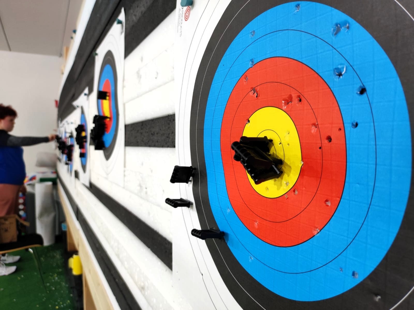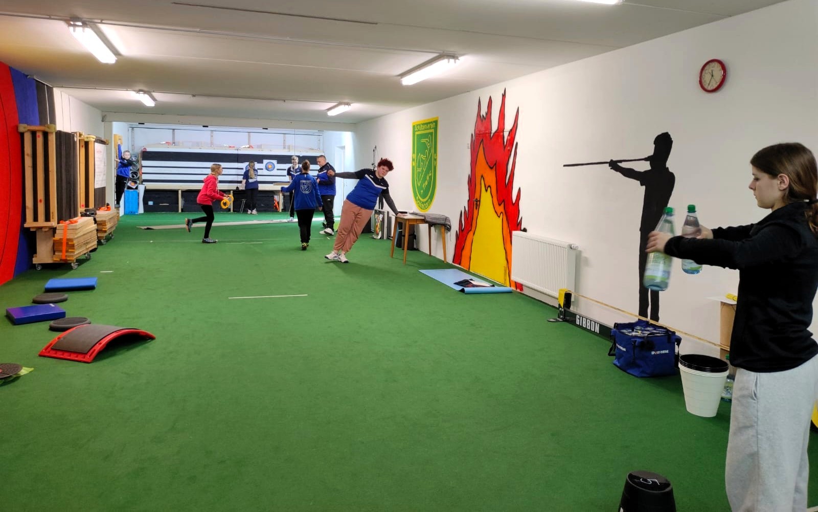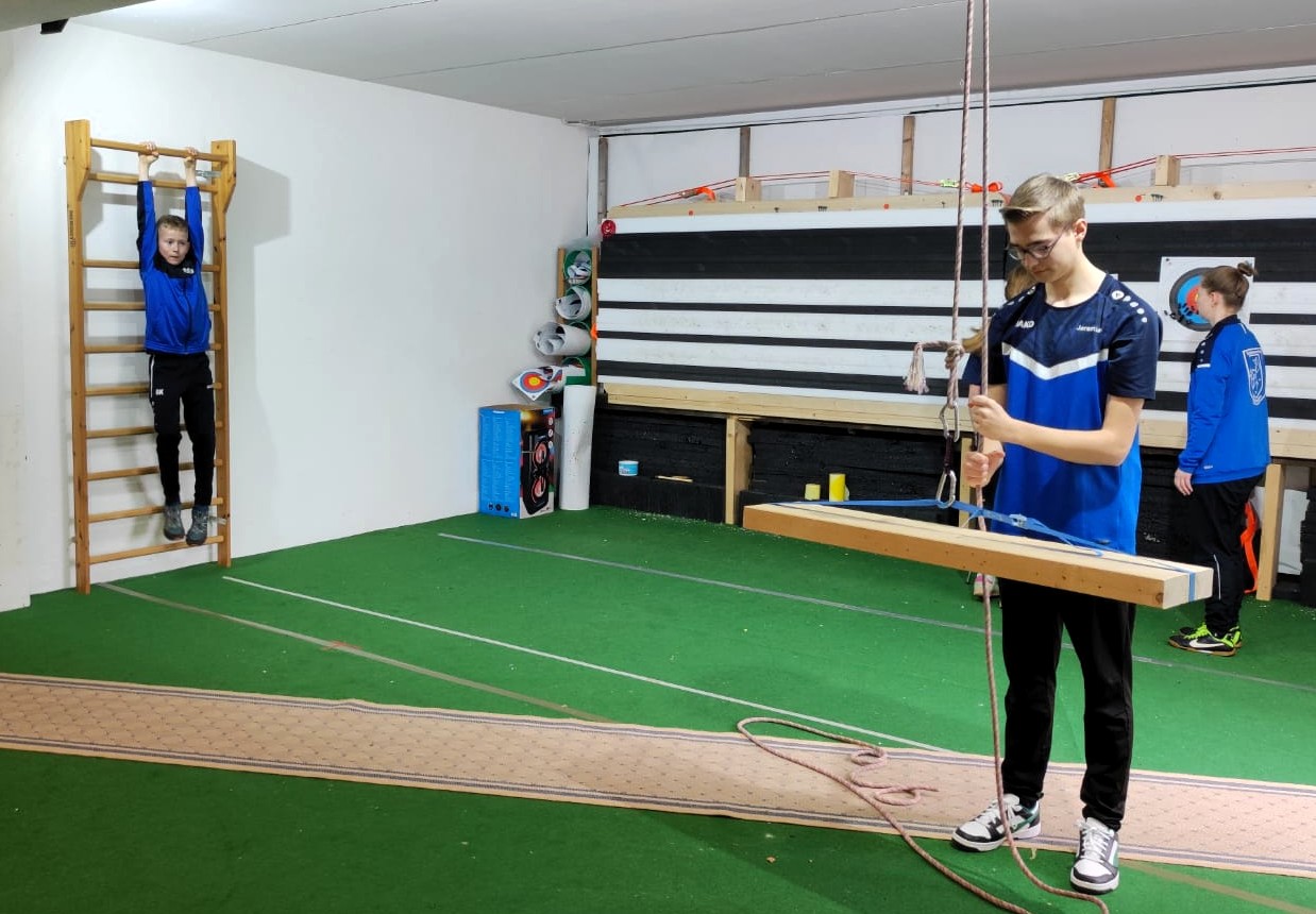 Nachdem uns bei der Physio-Einheit schon ordentlich eingeheizt wurde und während wir eine kleine Pause im Wirtschaftsraum einlegten, bereitete das Bogen-Trainer-Team, bestehend aus Marina und Dieter, einige Koordinations-Spiele und ein Zirkeltraining mit vielfältigen Übungen für den ganzen Körper vor.